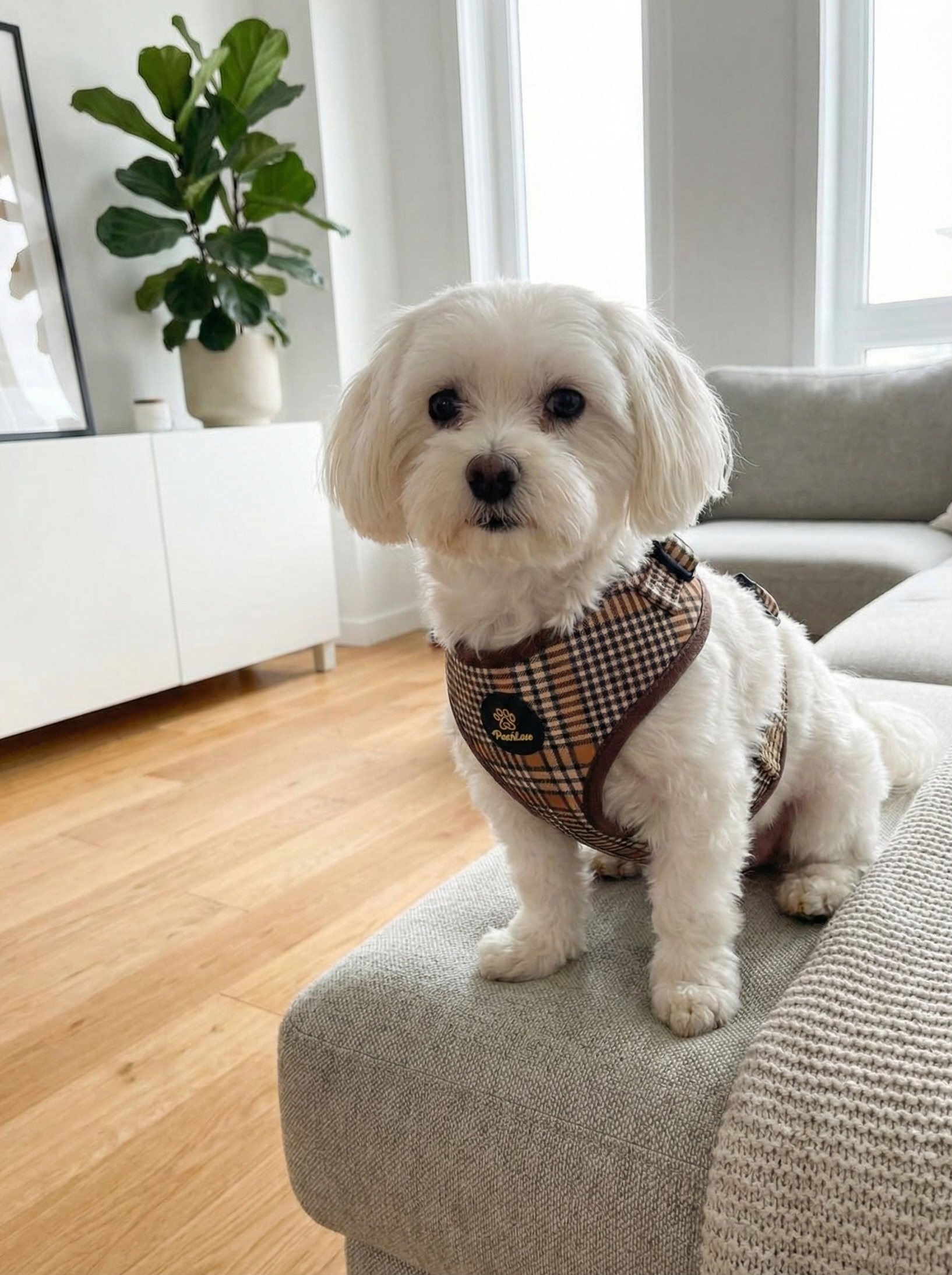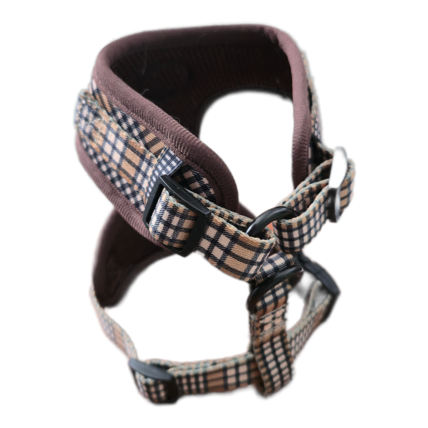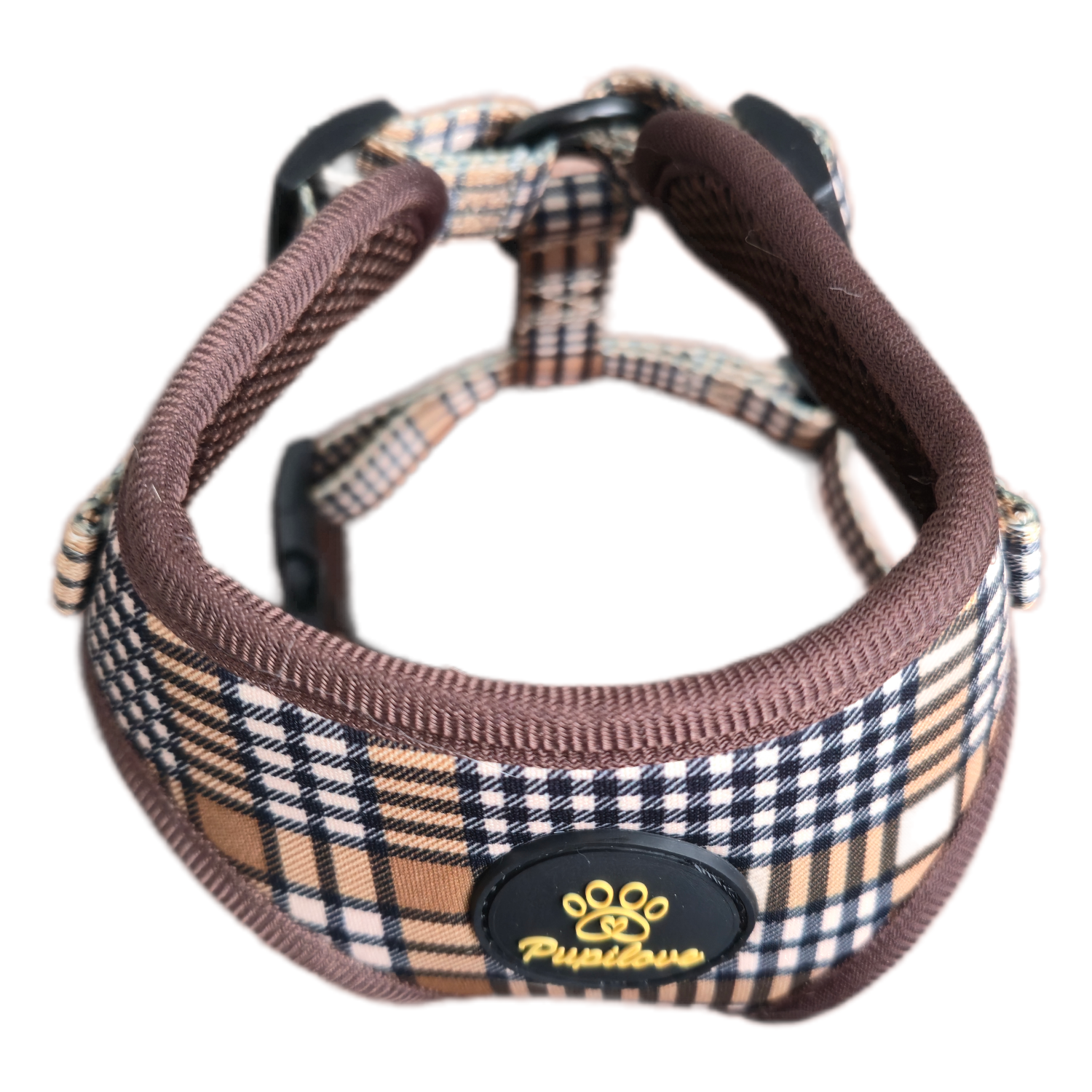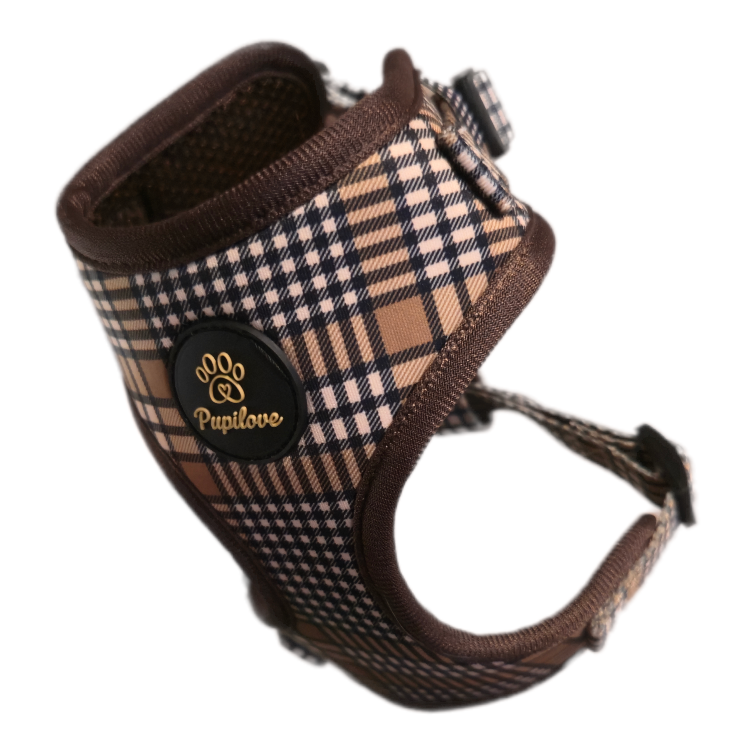 Detale, które robią różnicę Szelki wyróżniają się starannym wykończeniem. Elegancka lamówka w kolorze czekoladowym idealnie komponuje się z beżową kratą, a złote logo Pupilove na czarnej naszywce dodaje całości ekskluzywnego charakteru. Solidny, metalowy D-ring (uchwyt na smycz) gwarantuje bezpieczeństwo i wytrzymałość.